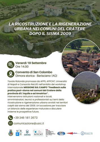 Il comune di Barisciano ospiterà venerdì 19 settembre la tavola rotonda “La ricostruzione e la rigenerazione urbana nei comuni del cratere dopo il sisma 2009”, inserita nel progetto congiunto “Missione sul campo”, promosso dall’Associazione francese d';ingegneria parasismica (Afps) e dall'Associazione Francese per la prevenzione delle catastrofi naturali e tecnologiche (Afpcnt), in collaborazione con l'Ufficio Speciale per la Ricostruzione dei Comuni del Cratere (Usrc), il Comune di Sant'Eusanio Forconese, l'Università Federico II di Napoli e con il contributo del consorzio universitario ReLuis.